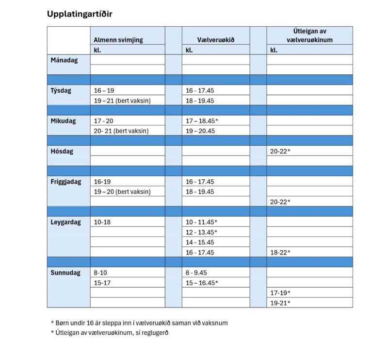 Vælveruøkið er opið, tá ið svimjihøllin er opin. Aldursmarkið er 16 ár.