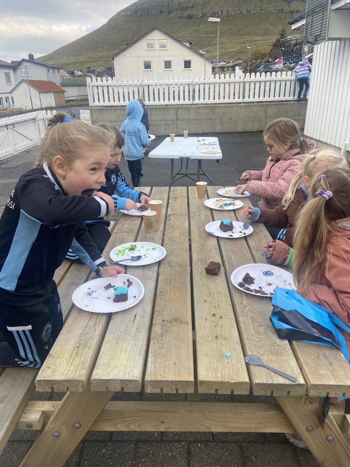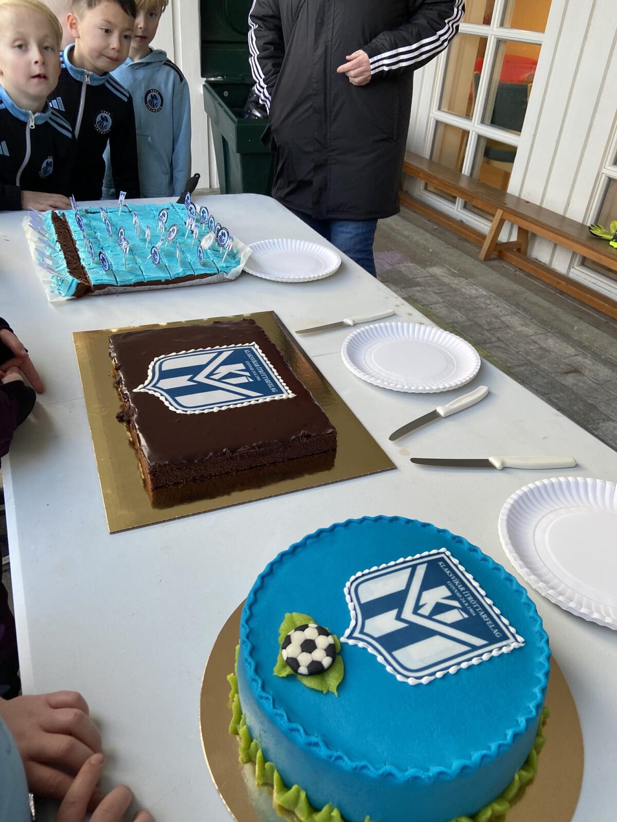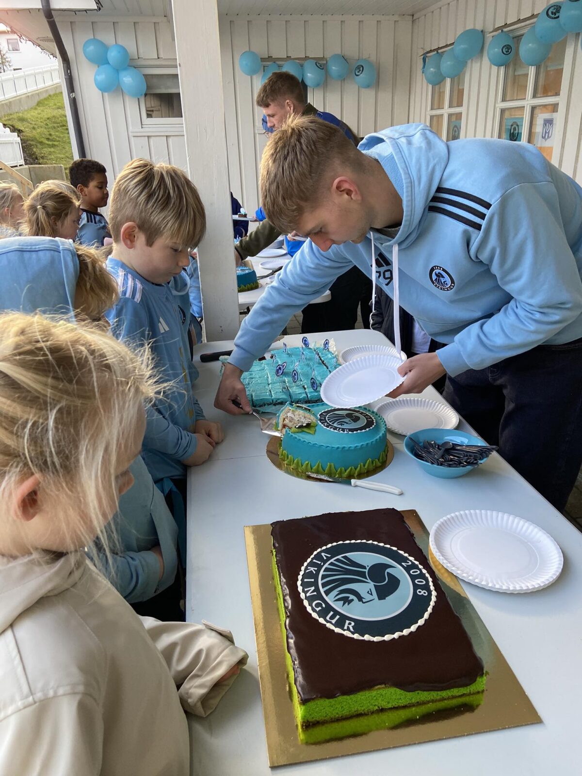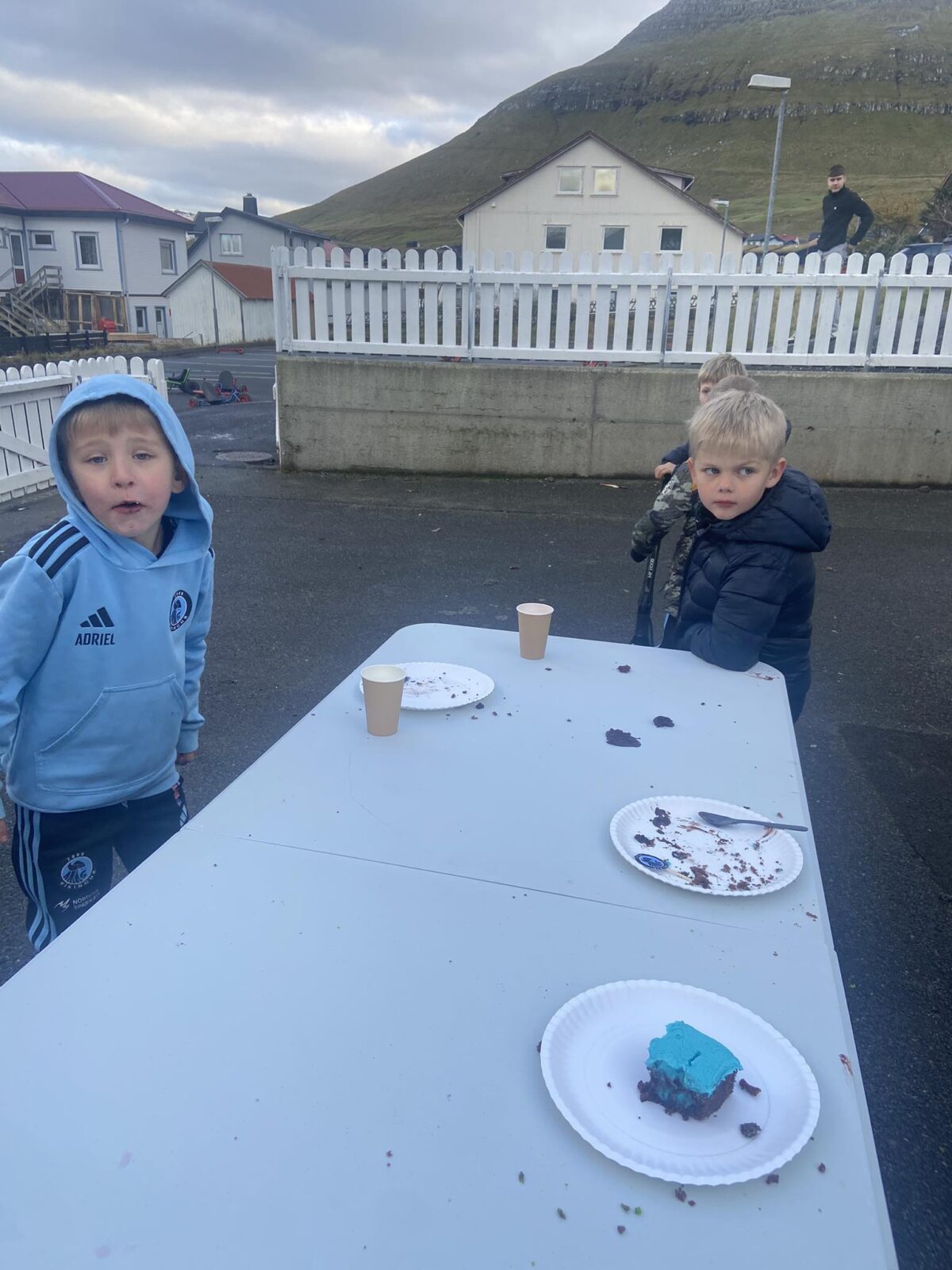 Ljósablá kaka stóð á borðinum og stemmningurin var í topp! Vit eru klár at rópa og ynskja Víkingi góða eydnu.